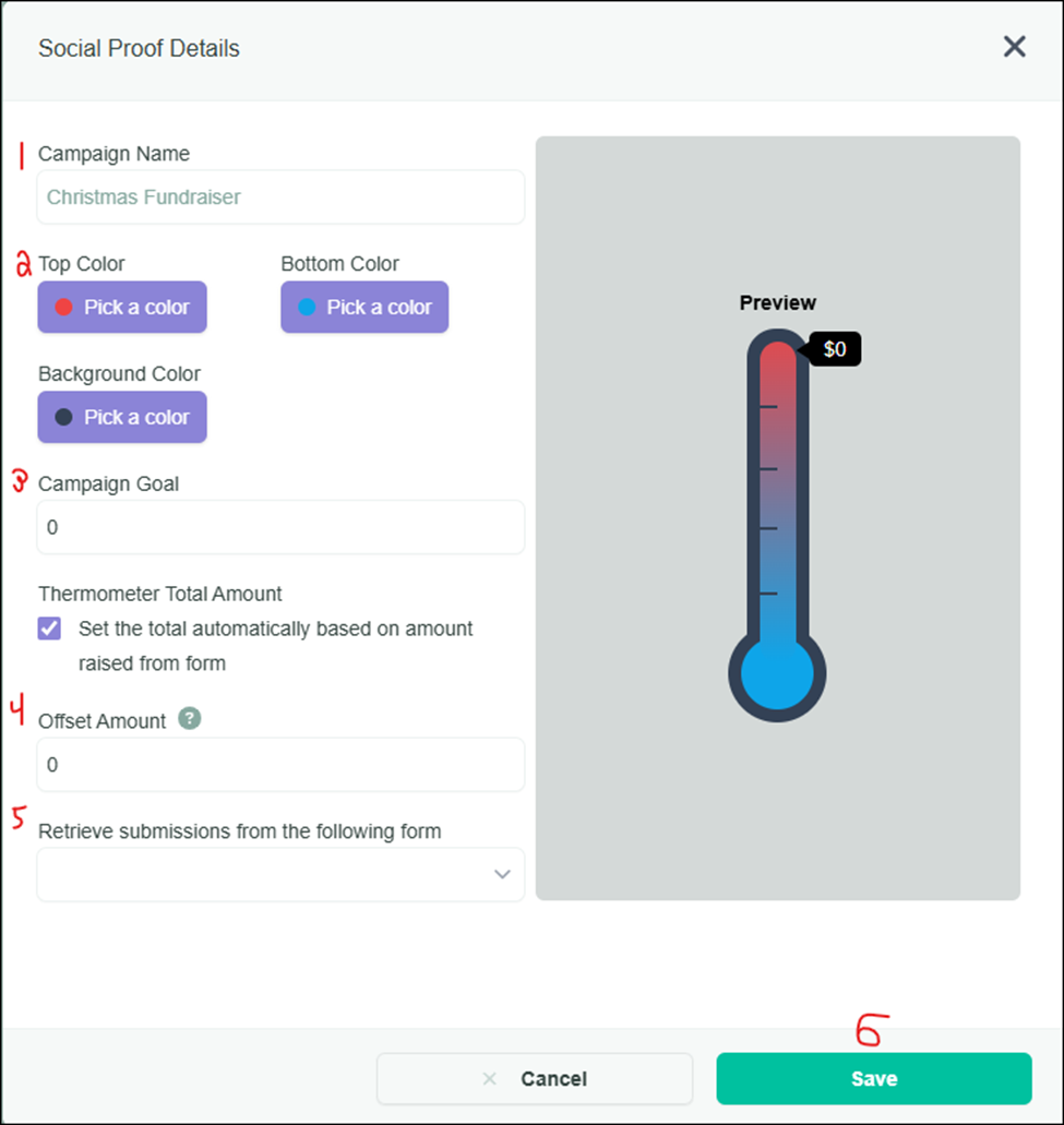 - Save and Preview: Click Save to apply changes. Use the Preview button to view how the thermometer appears on your live forms. It will display as a dynamic progress bar with current total, goal, and percentage.