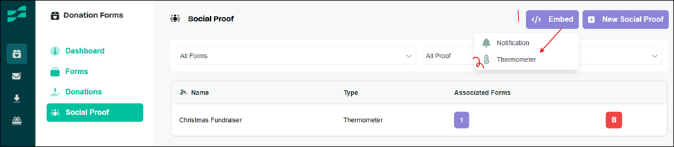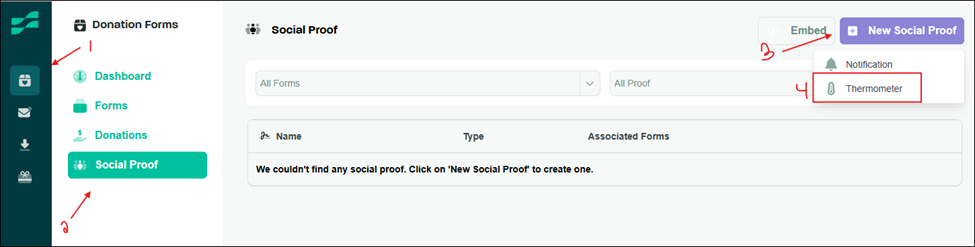 - Access Social Proof: Within the Donation Forms section, click the Social Proof button.