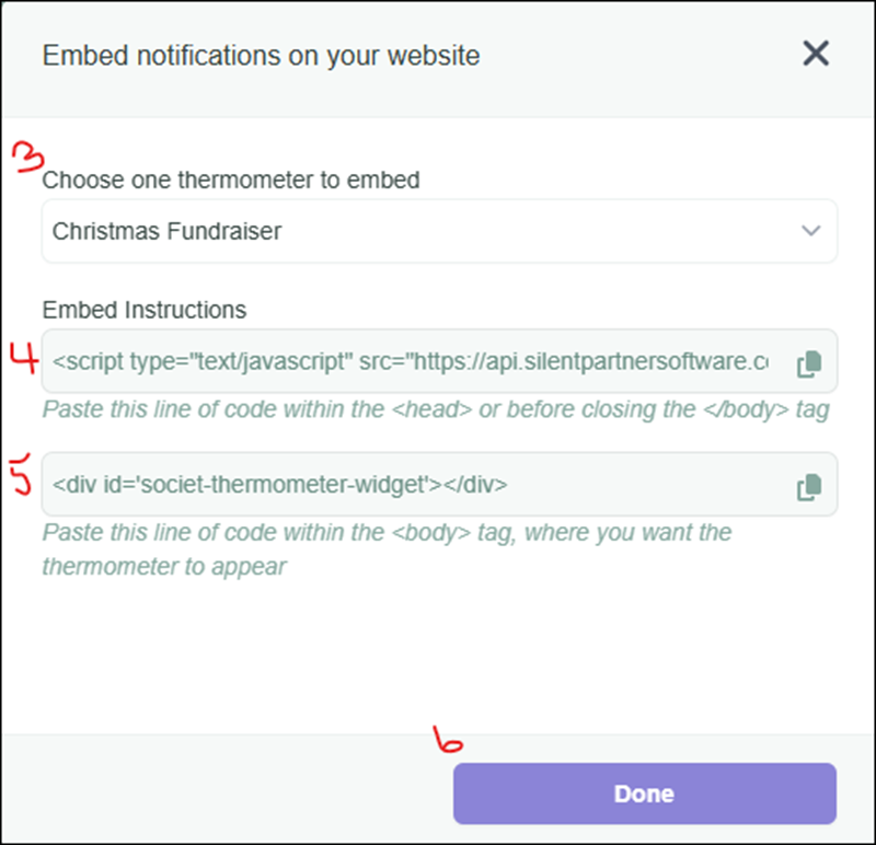 - Choose Your Thermometer: From the dropdown “Choose one thermometer to embed”, select your configured Thermometer.