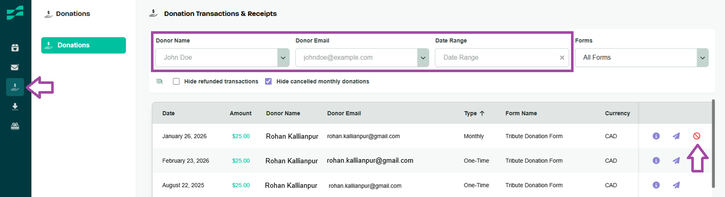 Use the filter options at the top of the list to narrow down the donations by the Donor's Name, Email, or the Donation Date.