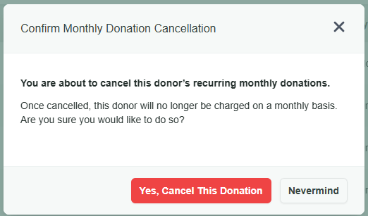 Please Note: Cancelling a recurring donation only stops future payments from that donor; it does not reverse or refund any previous donation(s) made by that donor.