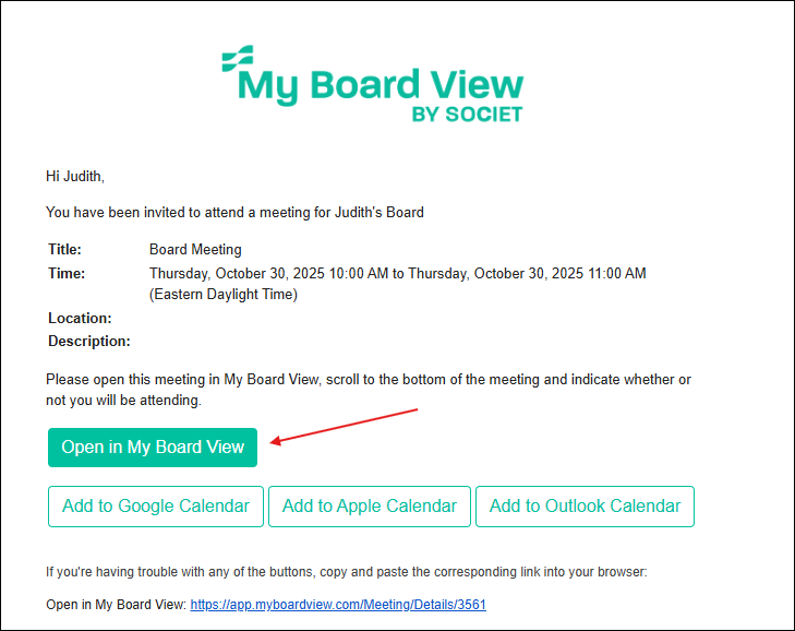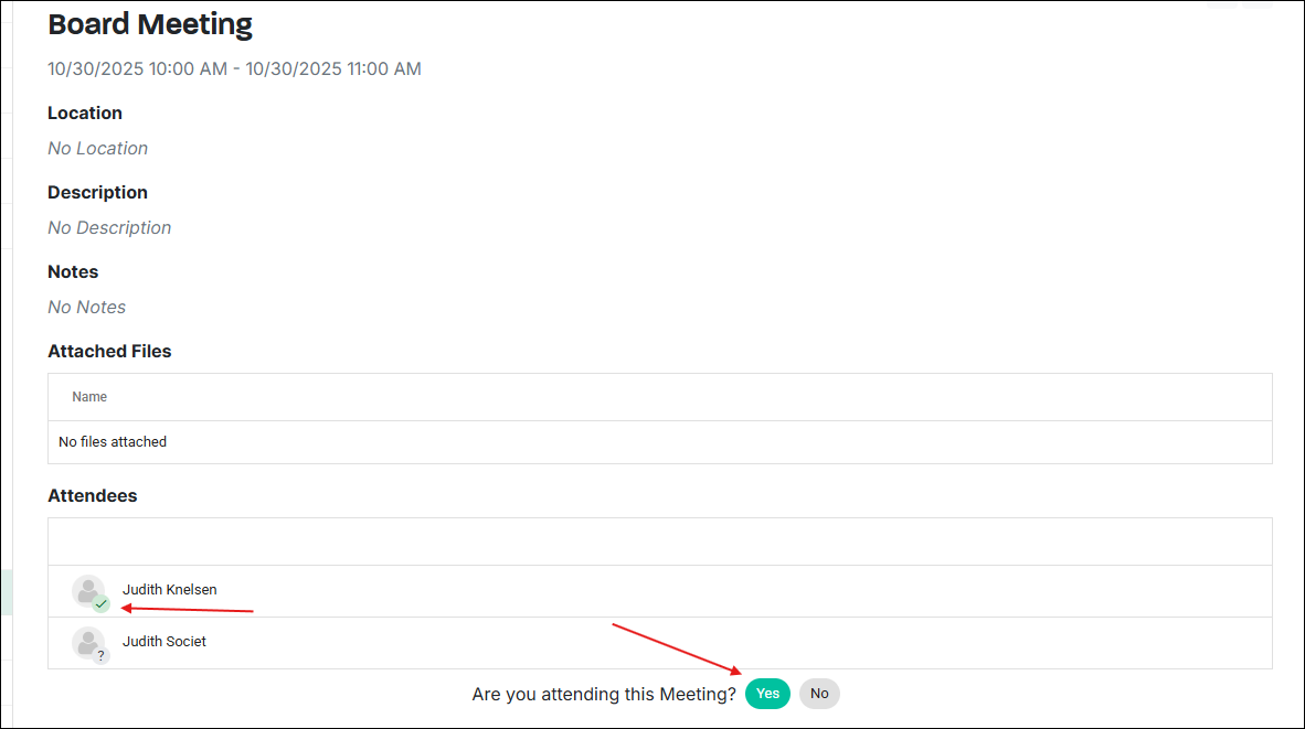 Once an attendee opens the meeting invitation email, clicks "Open in My Board View," and selects the "Yes" button to confirm their attendance, they will be marked with a check mark.