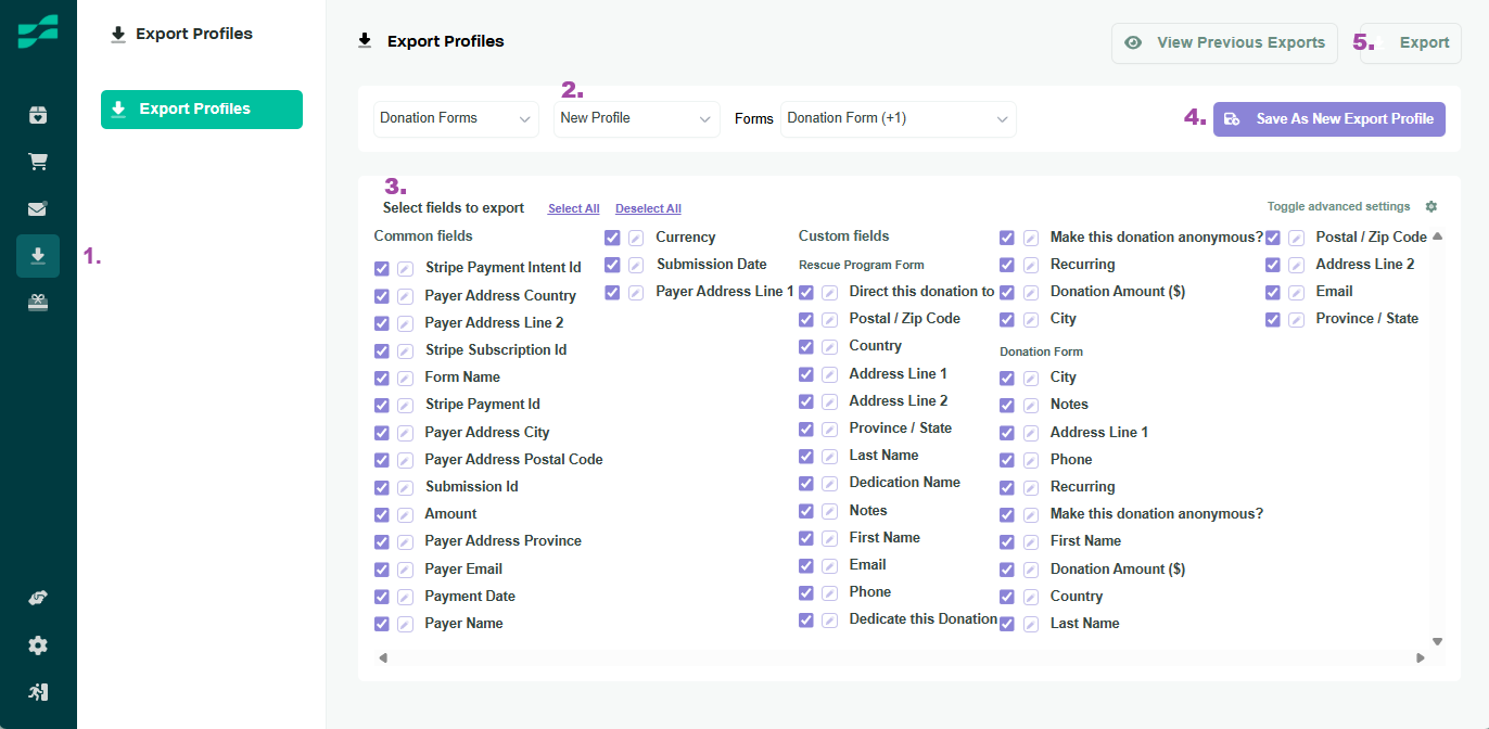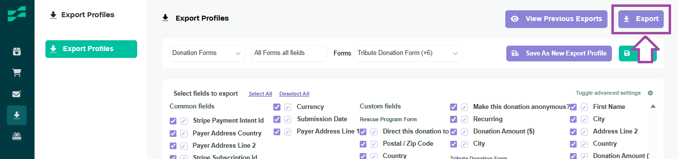 - Select the fields to export (e.g., Donor Name, Amount, Date). If you want to include all fields in your export, click "Select All."