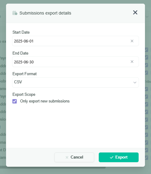 - Export Scope: Check to export only new submissions since the last export, or leave unchecked for all data.