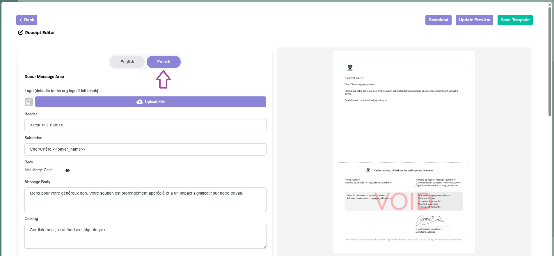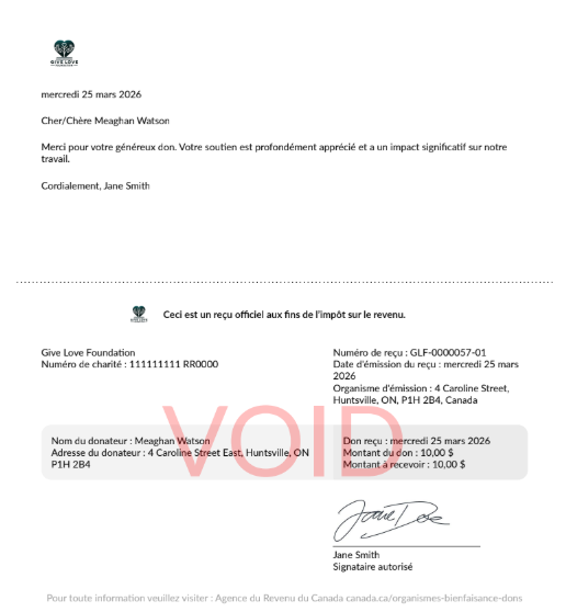Glass Register now provides both English and French language versions of the tax receipt. You can create an English and French, and donors' receipts will be automatically generated based on the language assigned to your donation forms!!