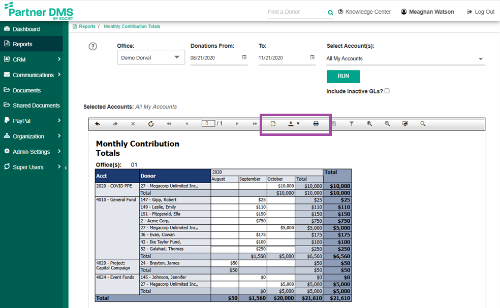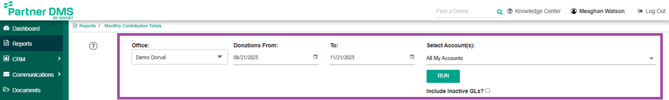 Select a start date under "Donations From:" and select an end date under "To:" Then select the Accounts to include in your report. Then click "Run."