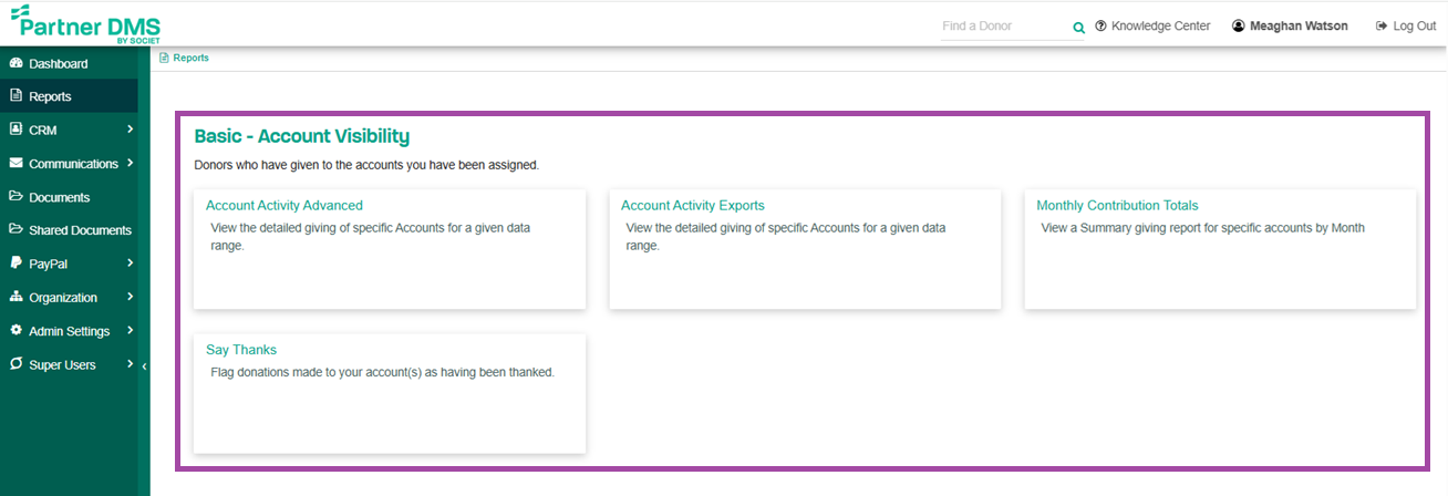 To view detailed information about your account activity or contributions to your accounts, select Reports from the green menu bar on the left of the screen.