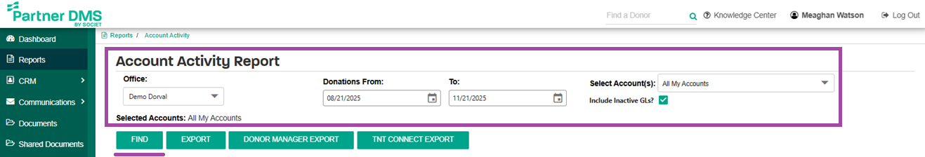 As with the Account Activity Exports report, if you have more than one Office set up for your organization, select it from the "Office" dropdown.