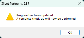 Click OK. Silent Partner will close, and you can restart the program to complete the update. After restarting, Silent Partner will let you know that it will run a complete checkup.