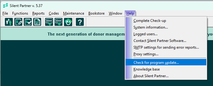 To check for a program update, go to your main green screen, click Help > Check for program updates.