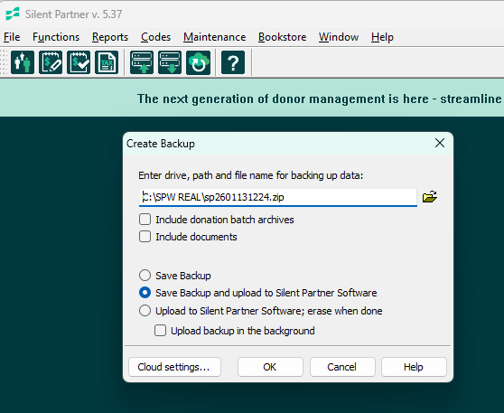 - Save Backup and Upload to Silent Partner Software: this will save your backup locally, but also send a copy to our servers